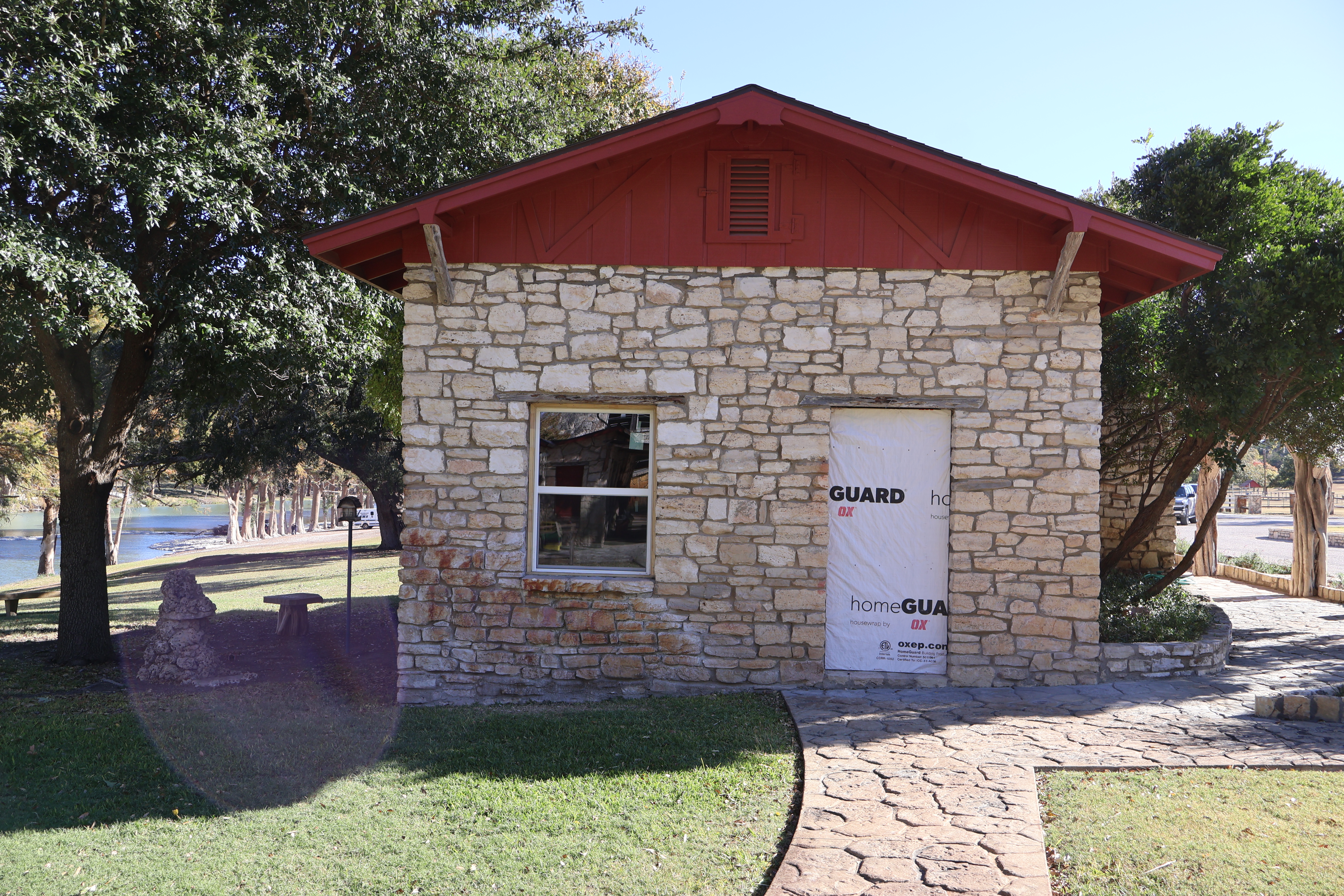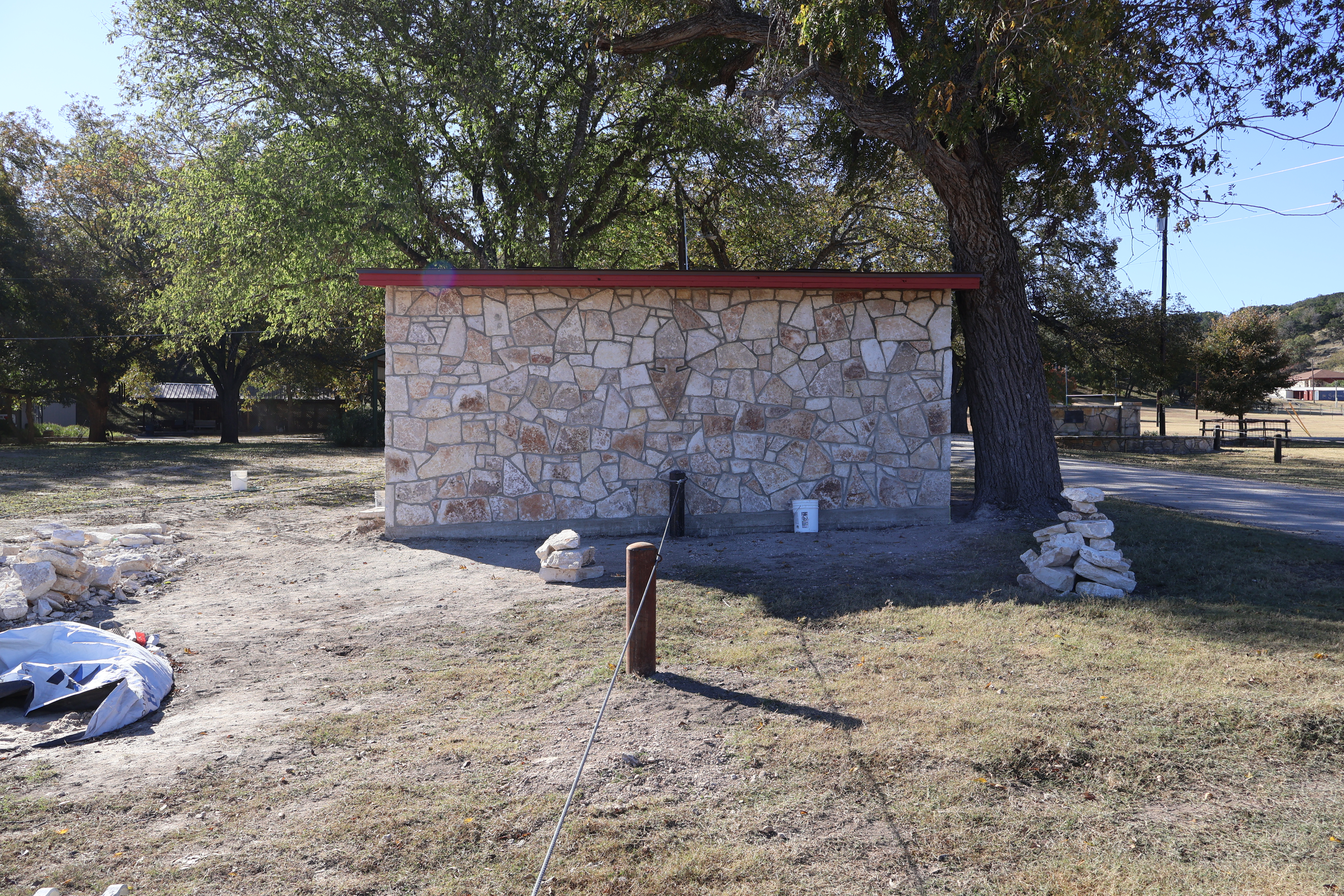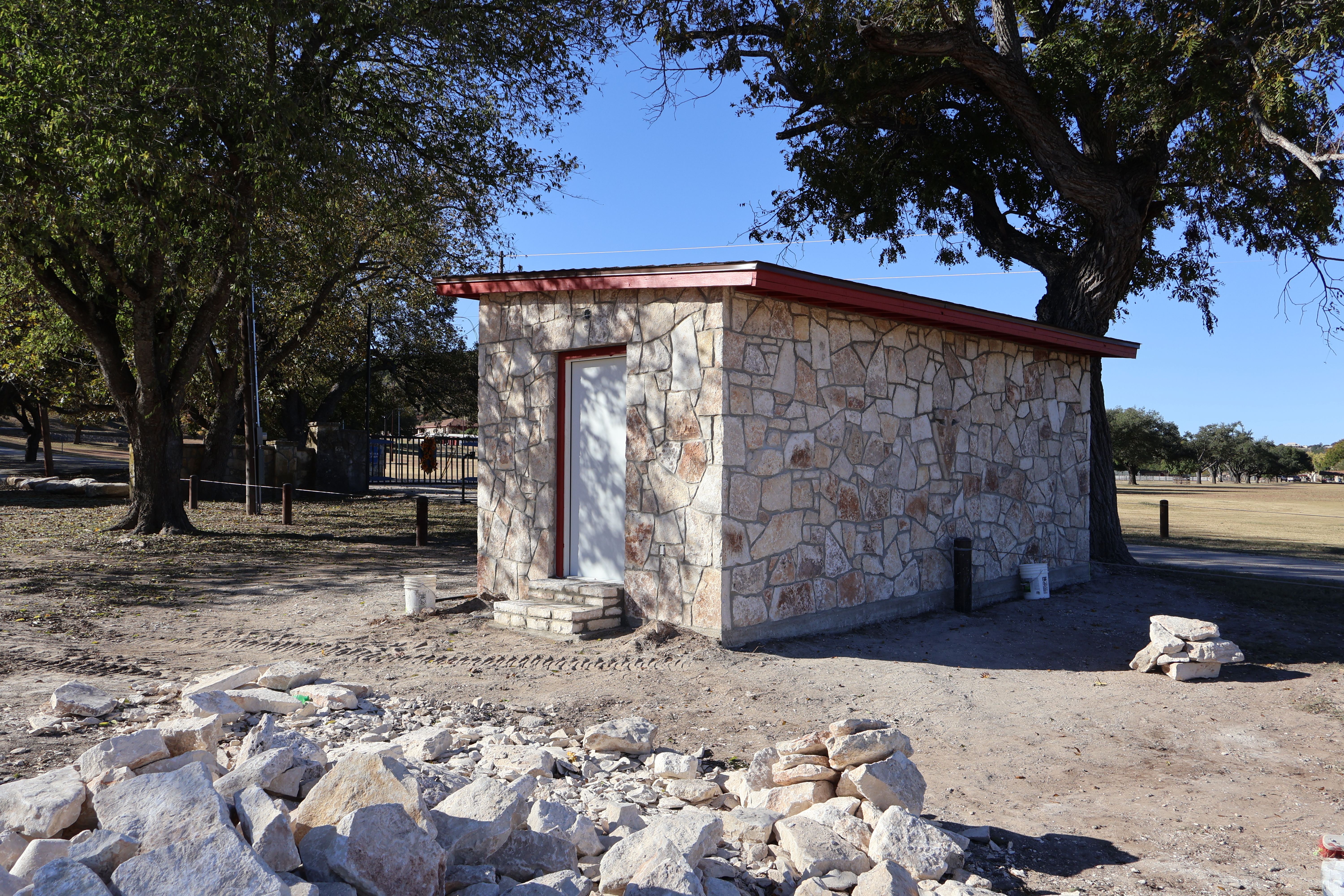 To your left as you approach the front gate, you might remember the two small pumphouses that once stood there. Both were completely destroyed in the flood, but they’ve now been replaced with a single pumphouse that covers both water wells in that area. The rock walls are now finished, and we even included an awesome arrowhead detail in the wall facing the river. This project is about 99% complete!