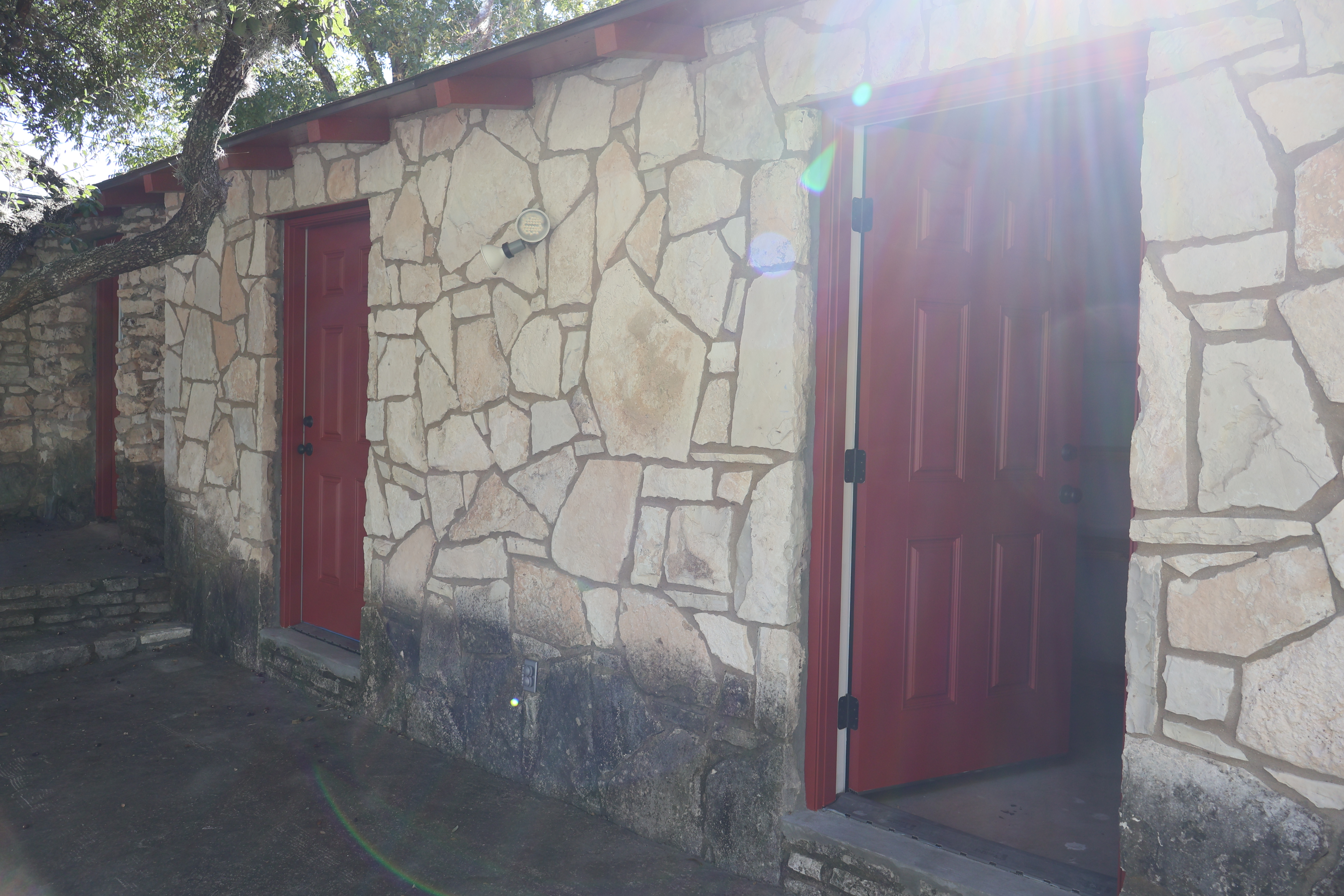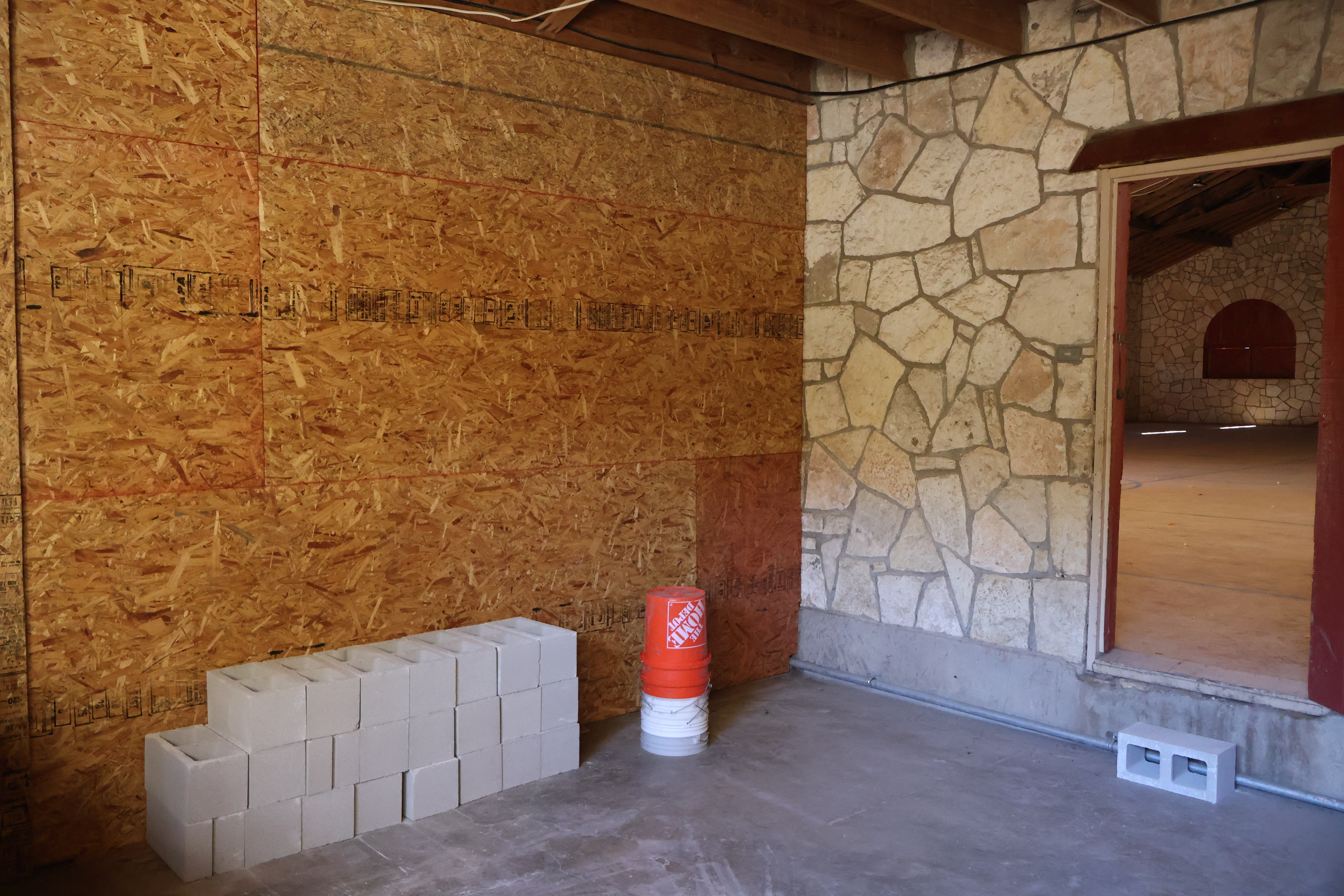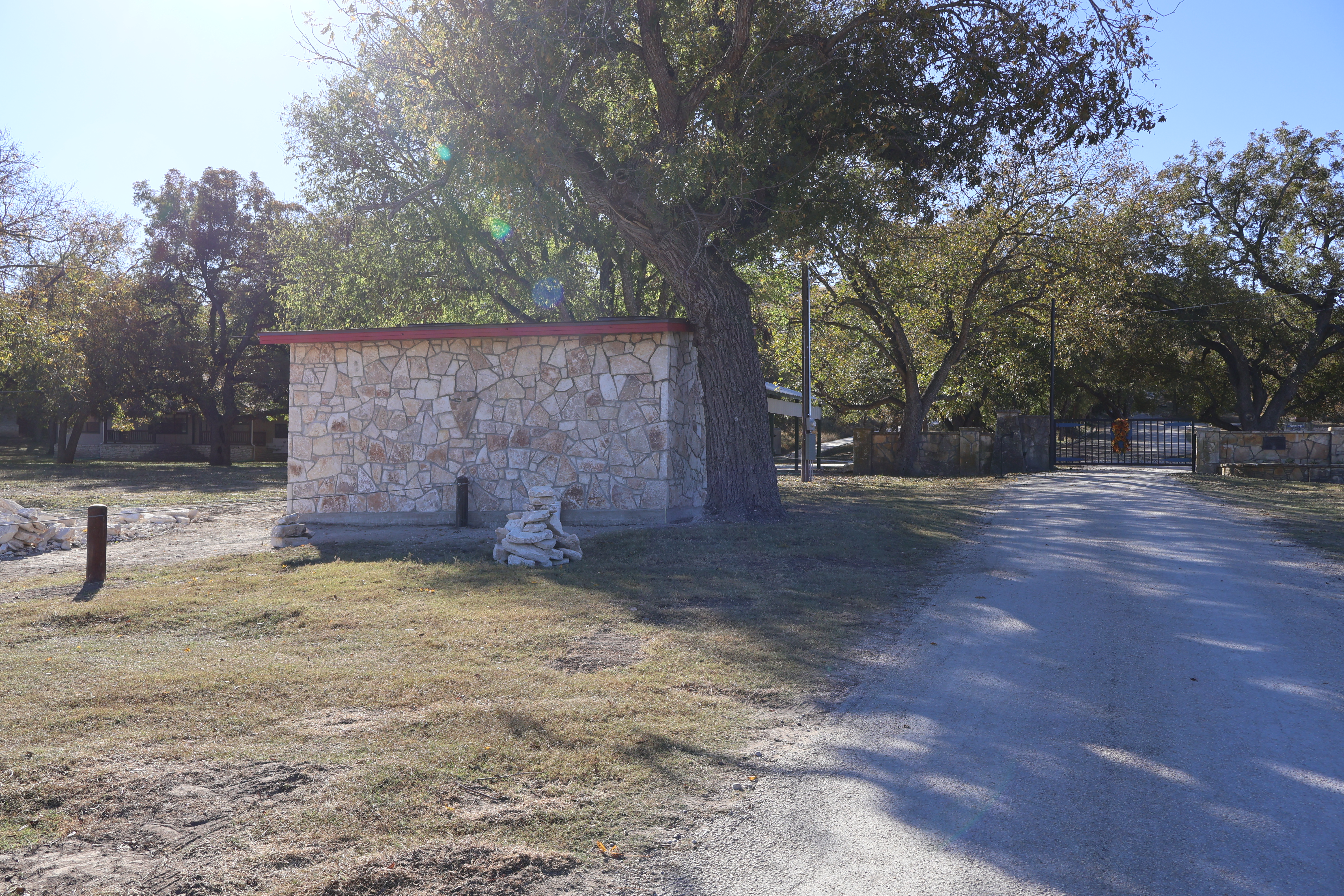 To your left as you approach the front gate, you might remember the two small pumphouses that once stood there. Both were completely destroyed in the flood, but they’ve now been replaced with a single pumphouse that covers both water wells in that area. The rock walls are now finished, and we even included an awesome arrowhead detail in the wall facing the river. This project is about 99% complete!