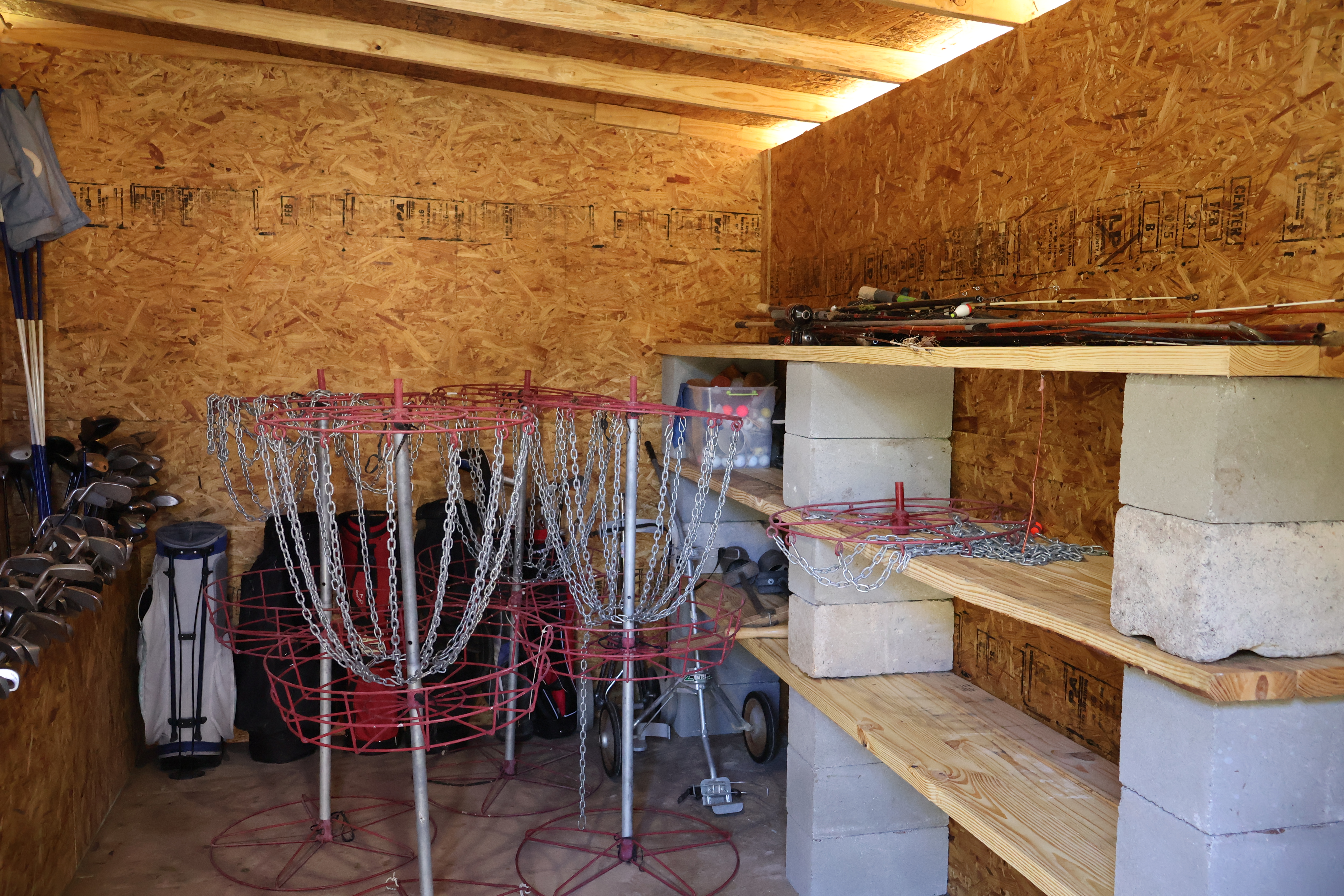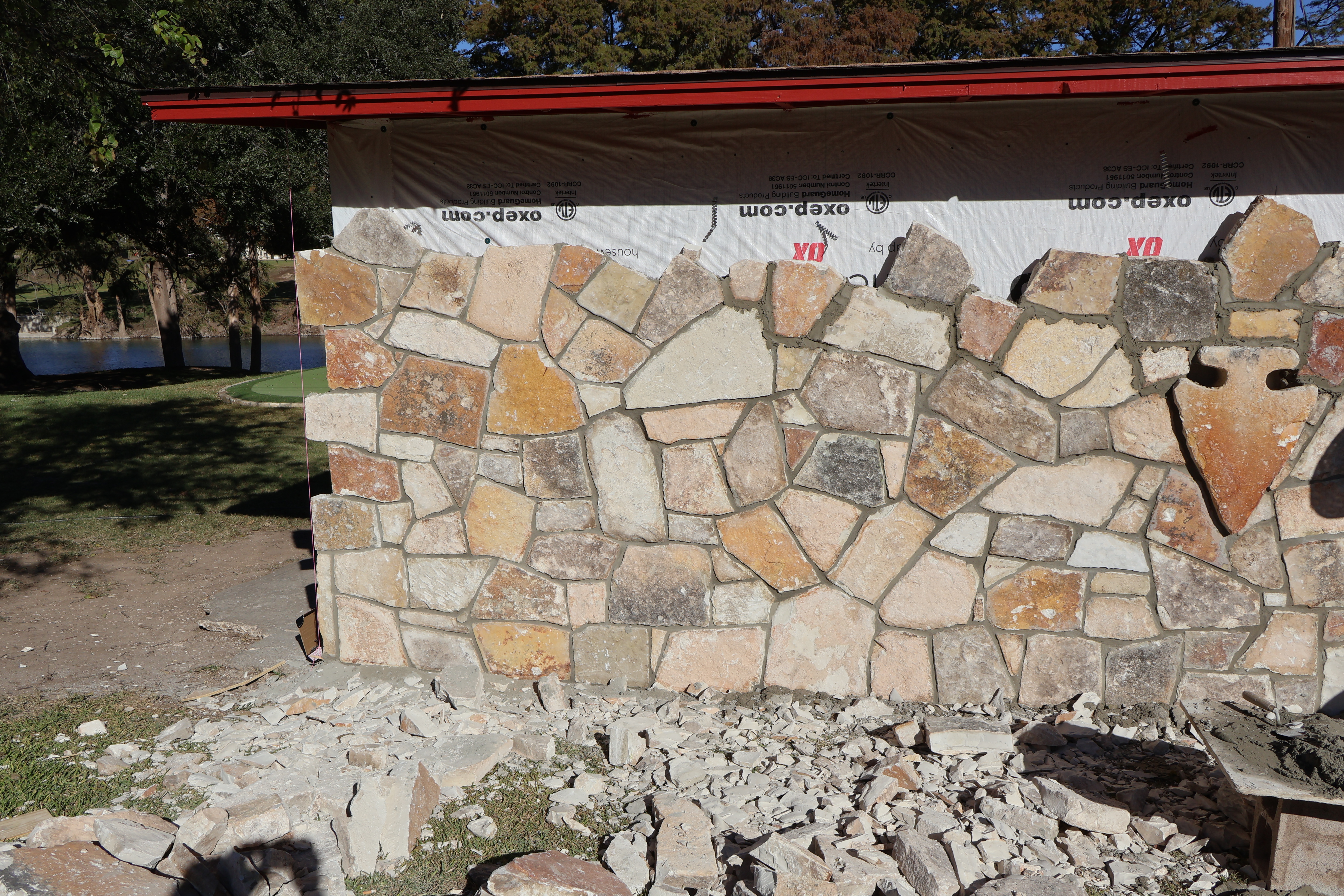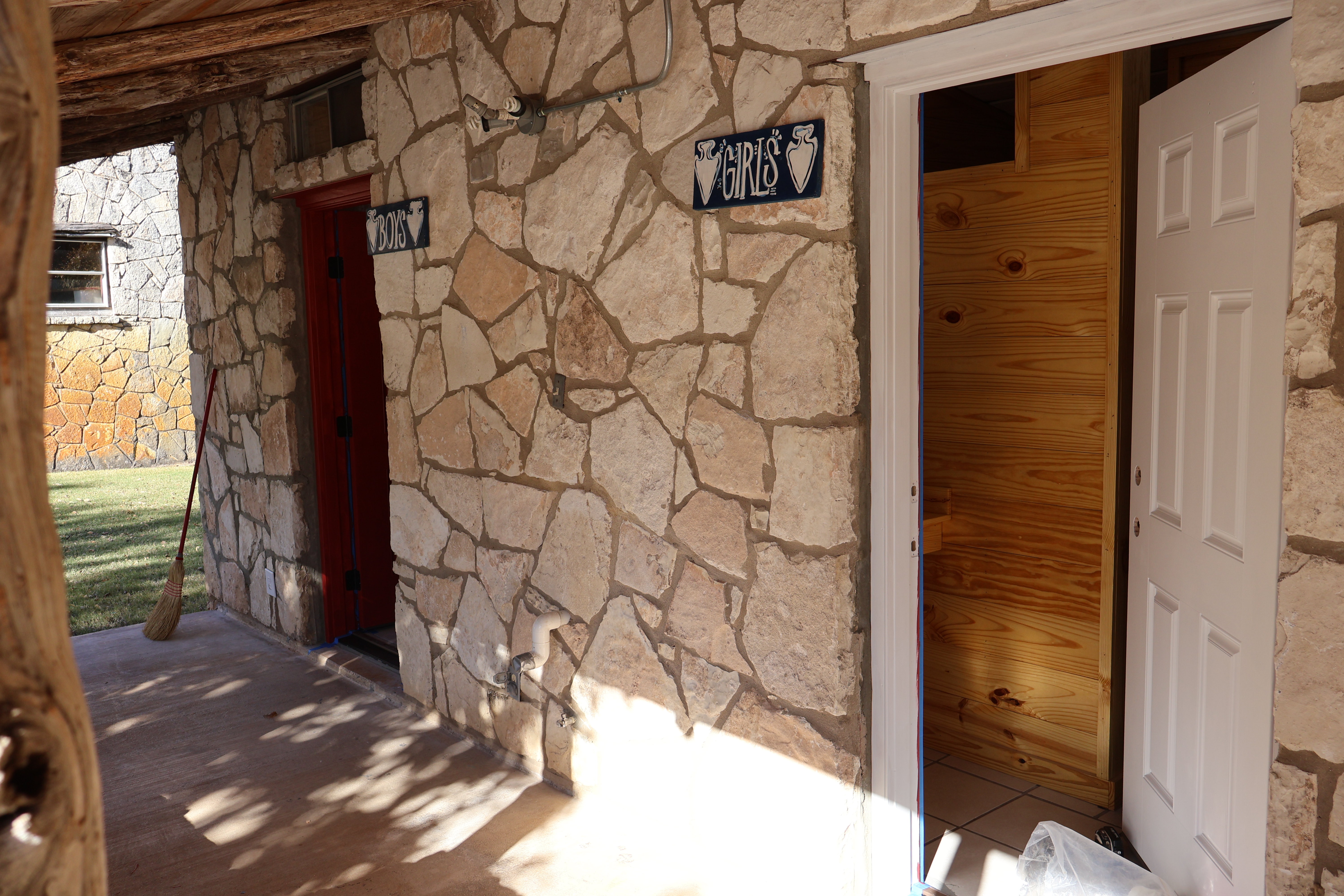 The Canoe Shed. The building itself has been completely rebuilt, and now we’re working to add the rockwork. Much of the stone from the original structure was salvageable, so you may recognize some familiar rocks in the new walls. Inside, we expanded the canoe/kayak closet (no pictures yet — our rock masons were hard at work in front of that door). On the golf/fishing side, the building is a couple of feet shorter than before, but it still offers plenty of space for everything we need. You might even spot some of the golf clubs that were donated or saved after the flood!