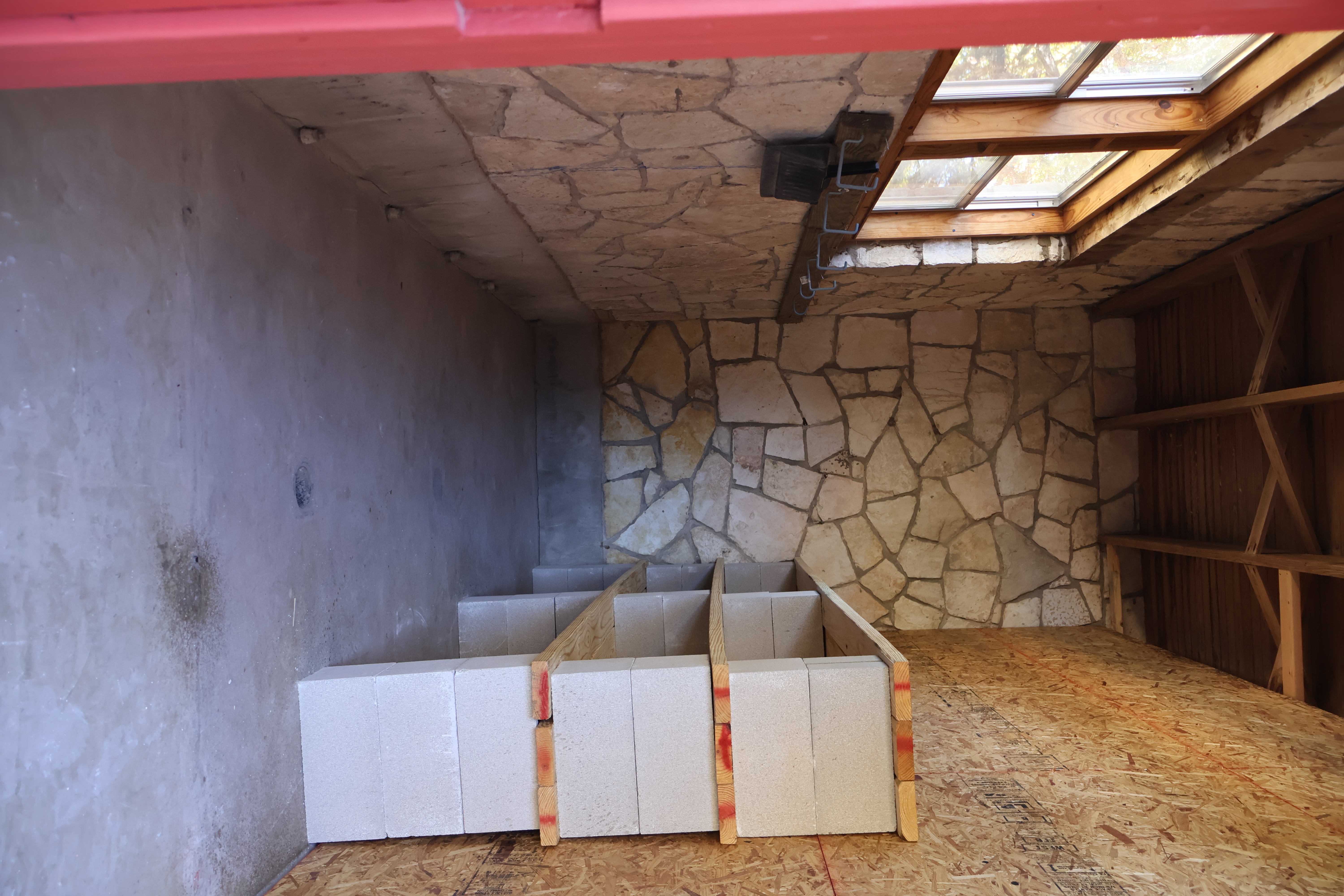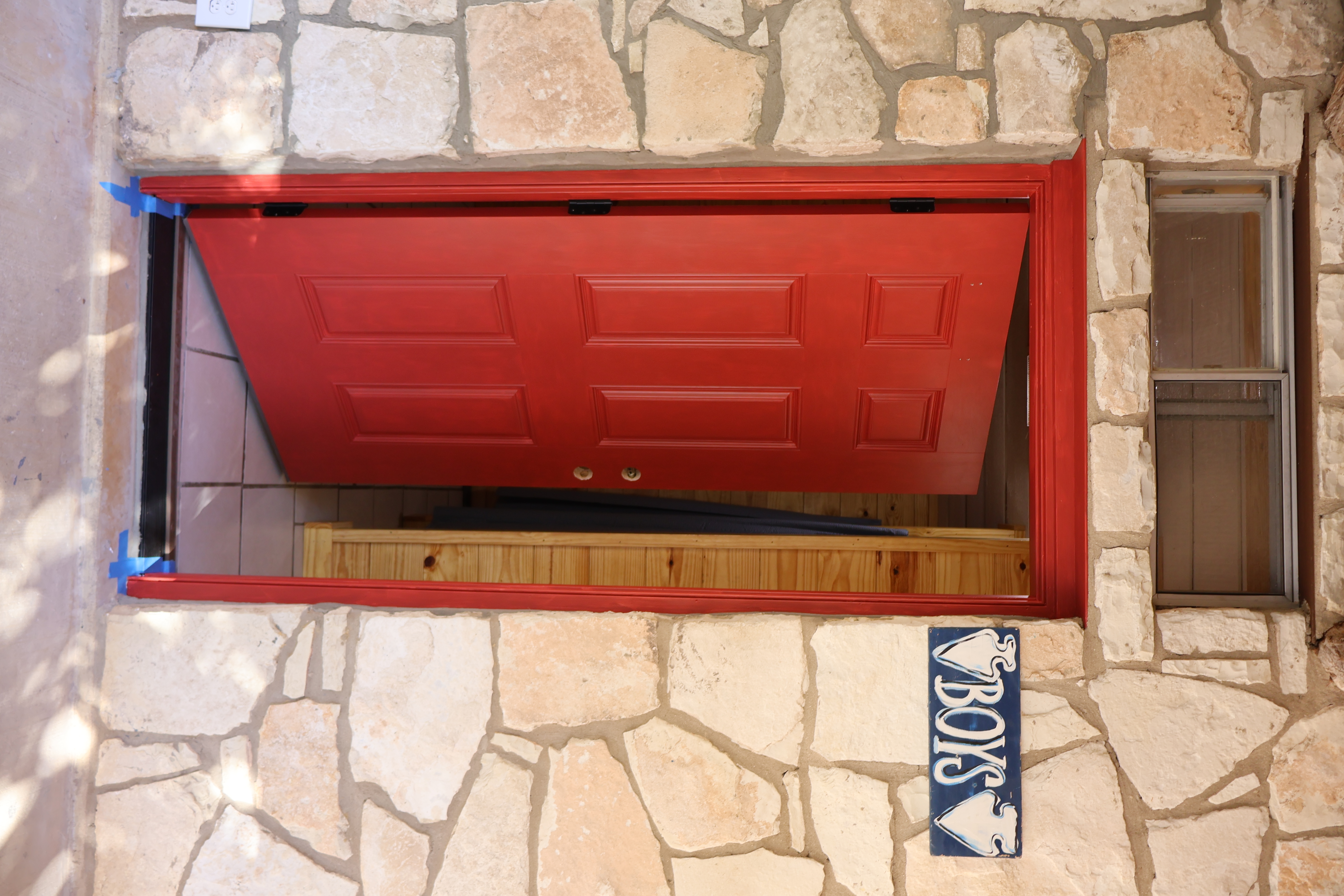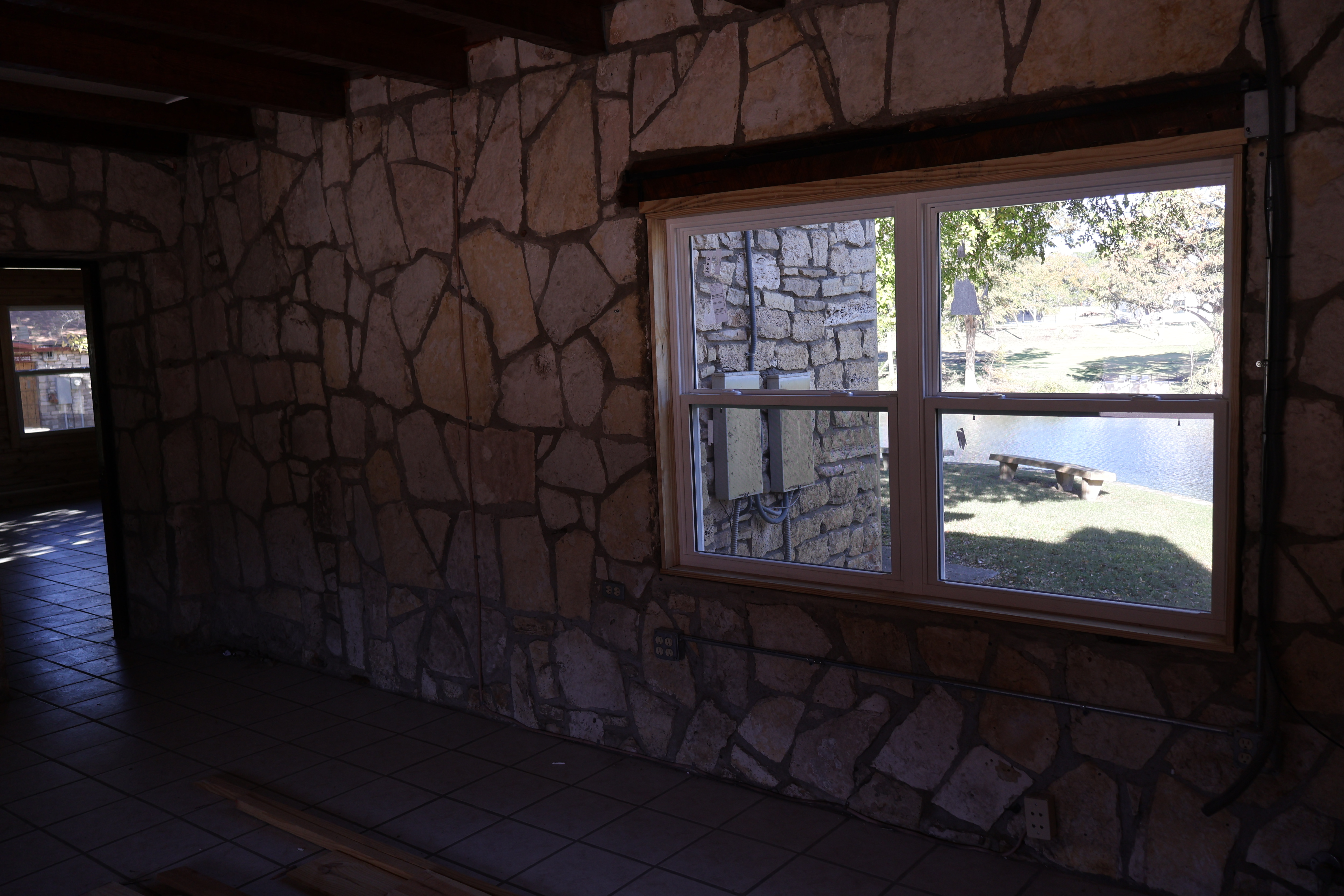 The Canoe Shed. The building itself has been completely rebuilt, and now we’re working to add the rockwork. Much of the stone from the original structure was salvageable, so you may recognize some familiar rocks in the new walls. Inside, we expanded the canoe/kayak closet (no pictures yet — our rock masons were hard at work in front of that door). On the golf/fishing side, the building is a couple of feet shorter than before, but it still offers plenty of space for everything we need. You might even spot some of the golf clubs that were donated or saved after the flood!